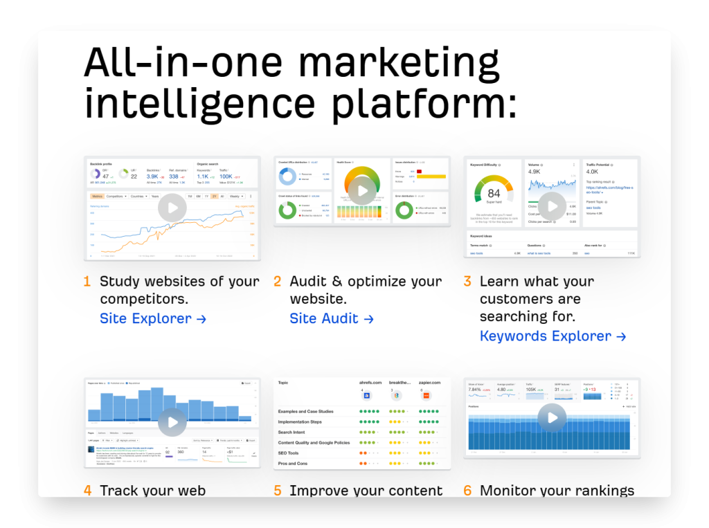 Анализ сайтов конкурентов (Site Explorer), Сбор ключевых слов (Keywords Explorer), ранжирование (Rank Tracker), Аудит сайта (Site Audit). Также есть ИИ-помощник для контента.