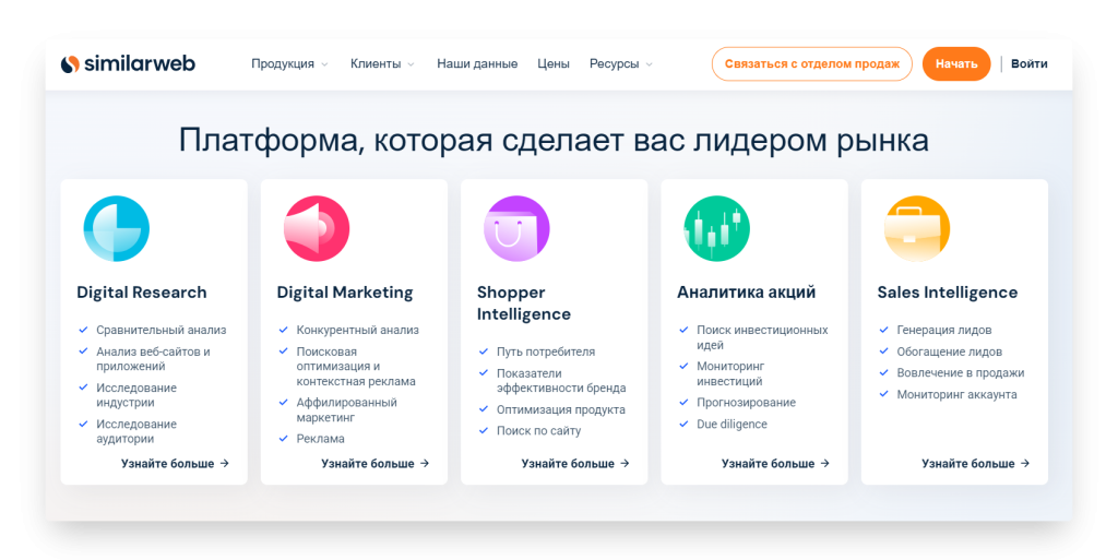 • Показывает сайты конкурентов и насколько они успешны в разных каналах маркетинга.