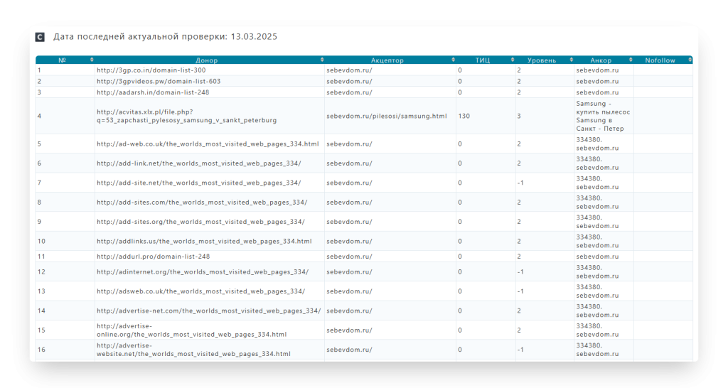 • Обратные ссылки с анкорами, донорами и посадочными