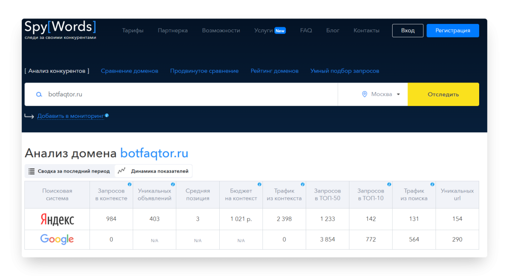 • Позволяет отслеживать и сравнивать позиции на поиске.