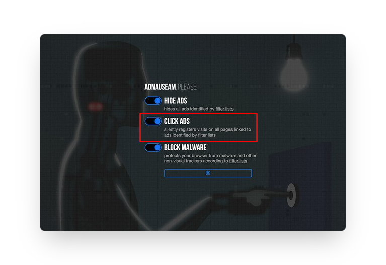 Это единственный блокировщик, который скрывает рекламу и в фоновом режиме скликиваниет её, генерируя фальшивые метрики и запутывая трекинговую рекламную систему. AdNauseam так же, как и другие блокировщики, использует списки фильтров, чтобы скрывать нежелательные объявления.