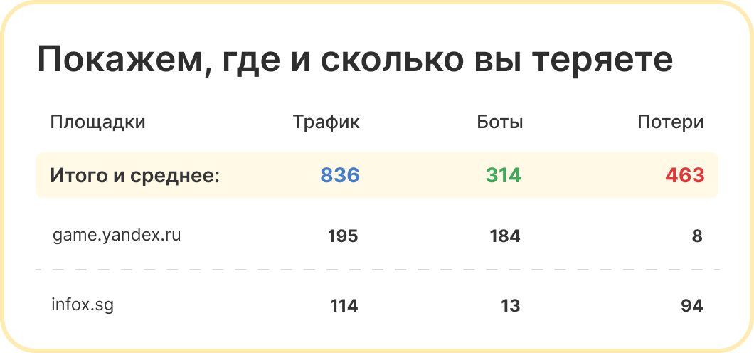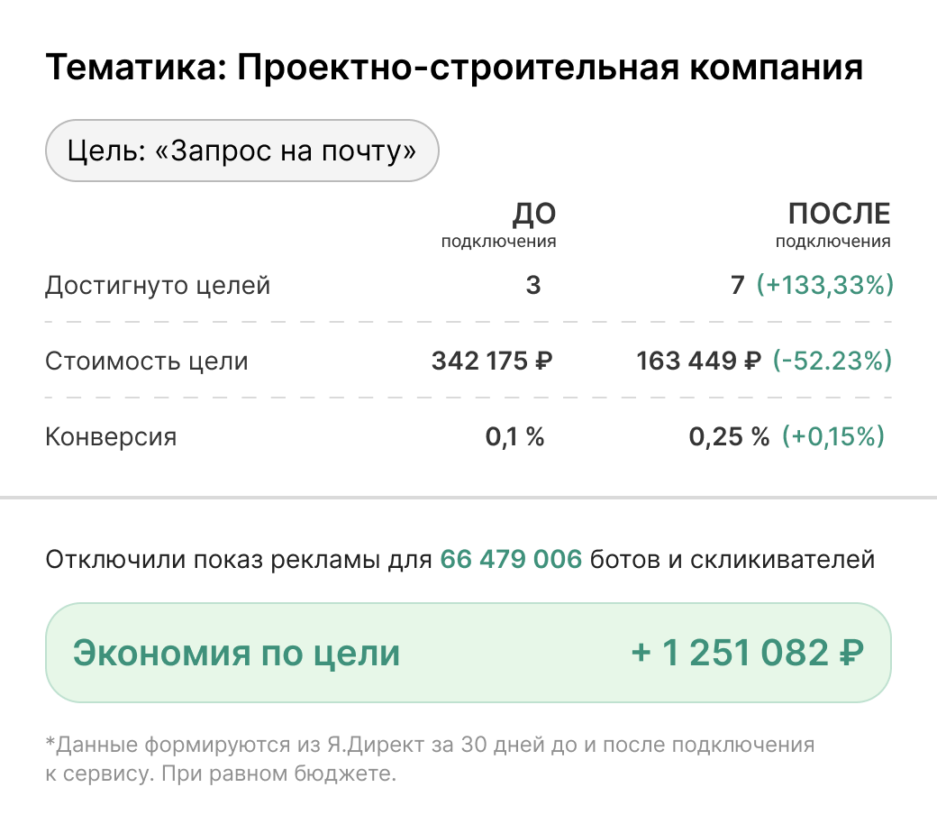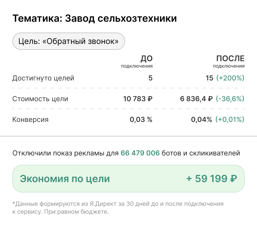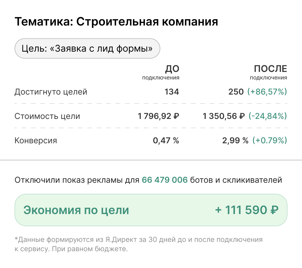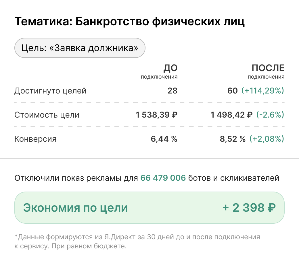 Отсекая ботов и нецелевые клики, мы помогаем увеличить долю качественного трафика - а значит, и количество реальных заявок