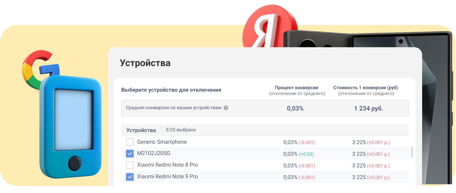 До 30% устройств, браузеров и ОС не дают конверсий. Яндекс Директ не позволяет вручную убрать эти неэффективные показы. Наш сервис “Hard Target” сможет найти и автоматически отключить их по API. В результате — ваша реклама будет только там, где есть конверсии