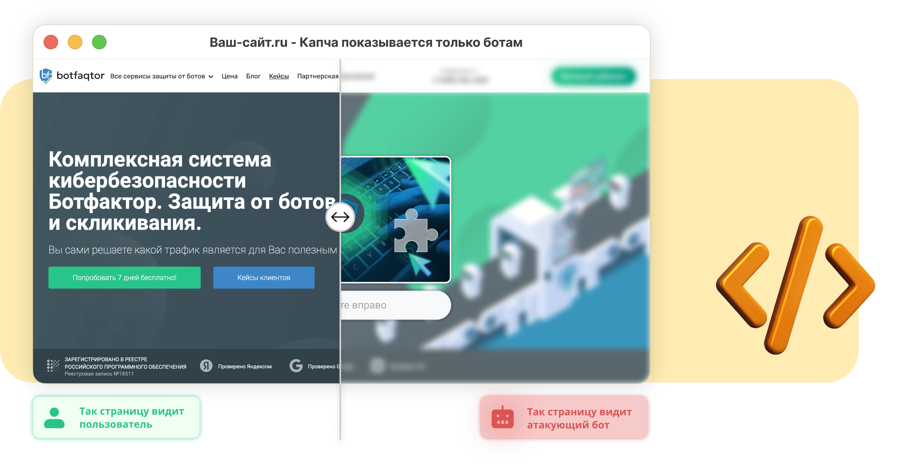 «Умная капча» показывается только ботам, не мешая реальным людям оставлять заявки. Просто установите ее на любые кнопки и формы вашего сайта — дальше система все сделает сама.