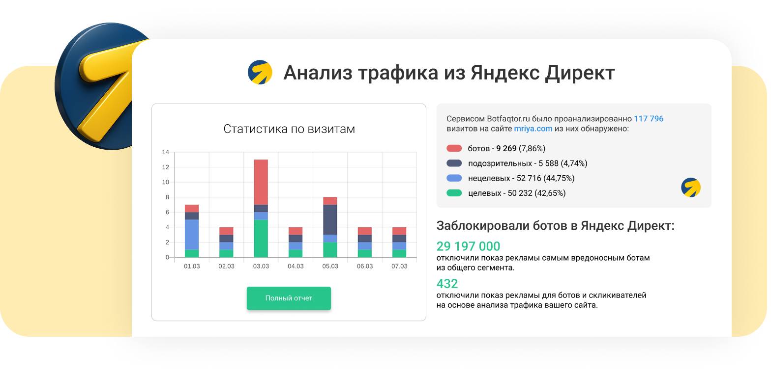 Защита «Яндекс Директ» анализирует весь трафик вашего сайта по 100+ техническим и поведенческим параметрам с помощью машинного обучения. Мы точно определим, кто перед вами — человек или бот, и автоматически заблокируем показы рекламы для скликивателей.